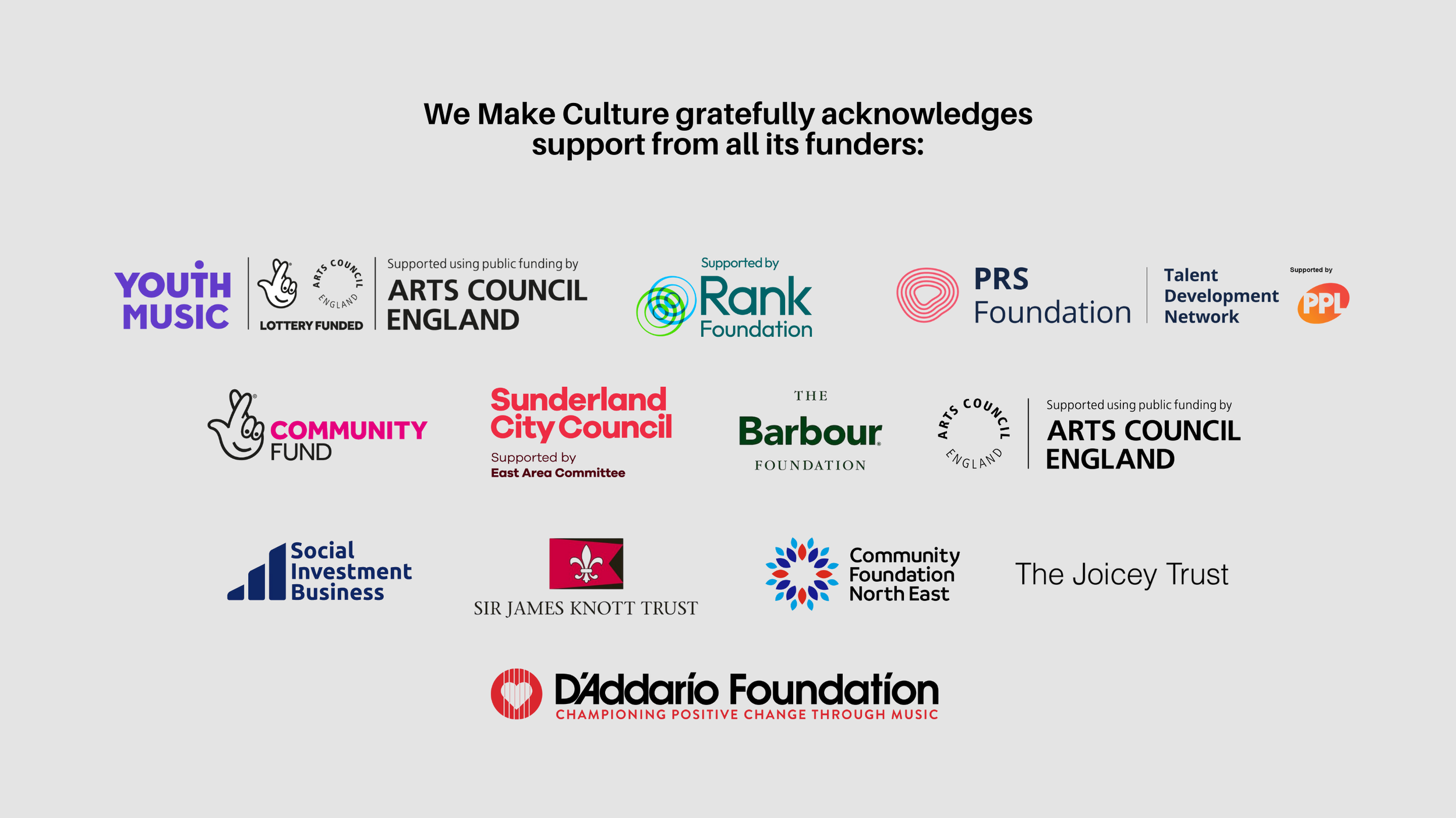 Funders and Partners PARTNERS Music Connects SunderlandSunderland CultureCulture StartBack on the MapLambton Street Youth and Community HubMore than GrandparentsWearside Women in NeedSunderland Music City FUNDERS Youth MusicRank FoundationPRS FoundationPPL UKNational Lottery Community FundSunderland City Council East Area CommitteeBarbour FoundationArts Council EnglandSocial Investment BusinessSir James Knott TrustCommunity Foundation North EastThe Joicey TrustD’Addario Foundation